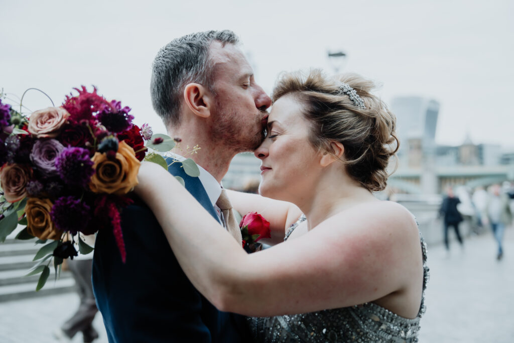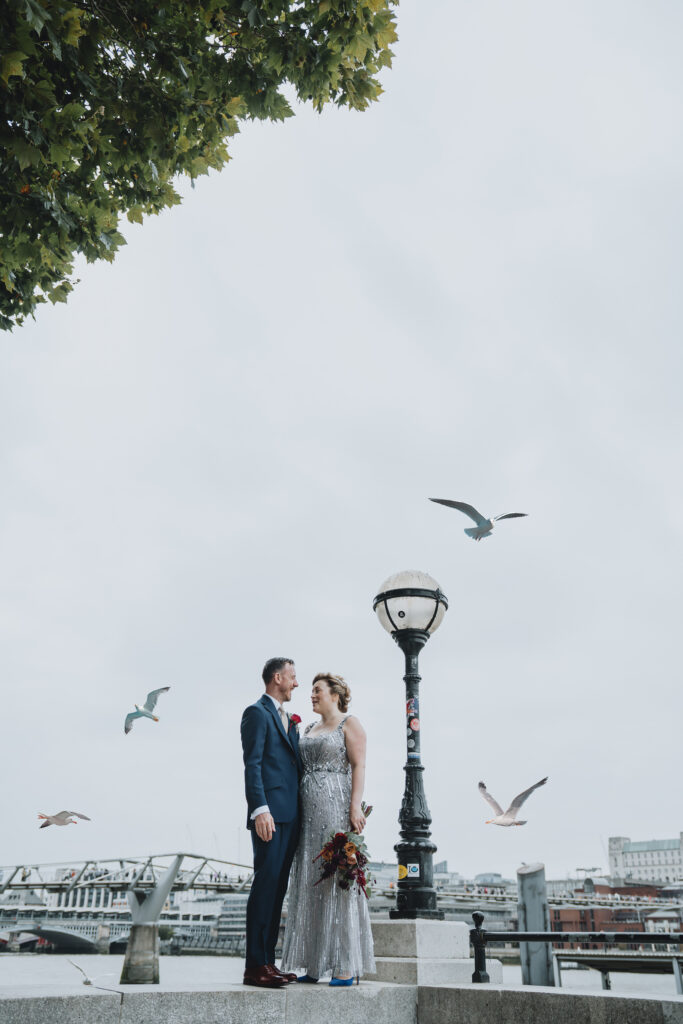 The newly wedded couple and I stepped outside for their private portrait session along the River Thames. These quiet moments are always my favourite part of the day, giving the couple a chance to step away from the buzz and simply enjoy being together. At this intimate time, I subtly encourage natural interactions, ensuring the photos feel authentic and unforced.